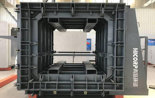 预制混凝土箱涵模具是采用工厂化批量生产的方式预制箱涵的专用模具;预制箱涵的优势在于,在施工场地进行拼装成型,生产与基槽开挖同时进行,替代当前现浇式施工方法,安装后可及时回填,大大缩短了工程建设周期;同时,采用工厂化批量生产,质量容易控制;现场施工周期短,降低了周边交通和环境的影响,大大提高了安装效率。