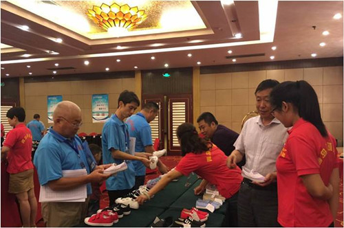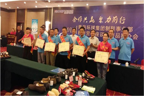 在会议中首先进行了颁奖仪式,制鞋事业部销售经理丁相亭宣读了2016年度表彰经销商人员名单,对评选出全年销售额前三甲经销商、最佳新经销商、增长速度最快经销商和诚信经销商等6位经销商进行了表彰,集团领导为获奖经销商颁发了证书和绶带。